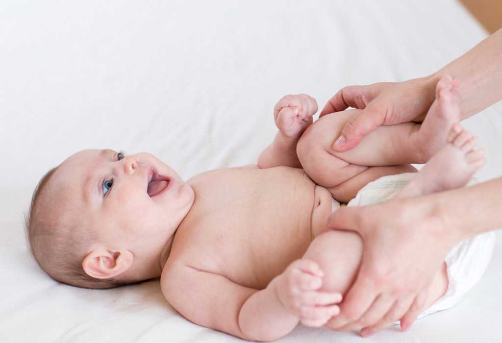 - Ребёнок подтягивает ножки к животику или сучит ими.