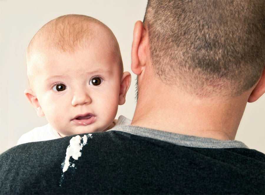 Когда после кормления малыш срыгивает, происходит выбрасывание наружу небольшого количества пищи из желудка через полость рта.