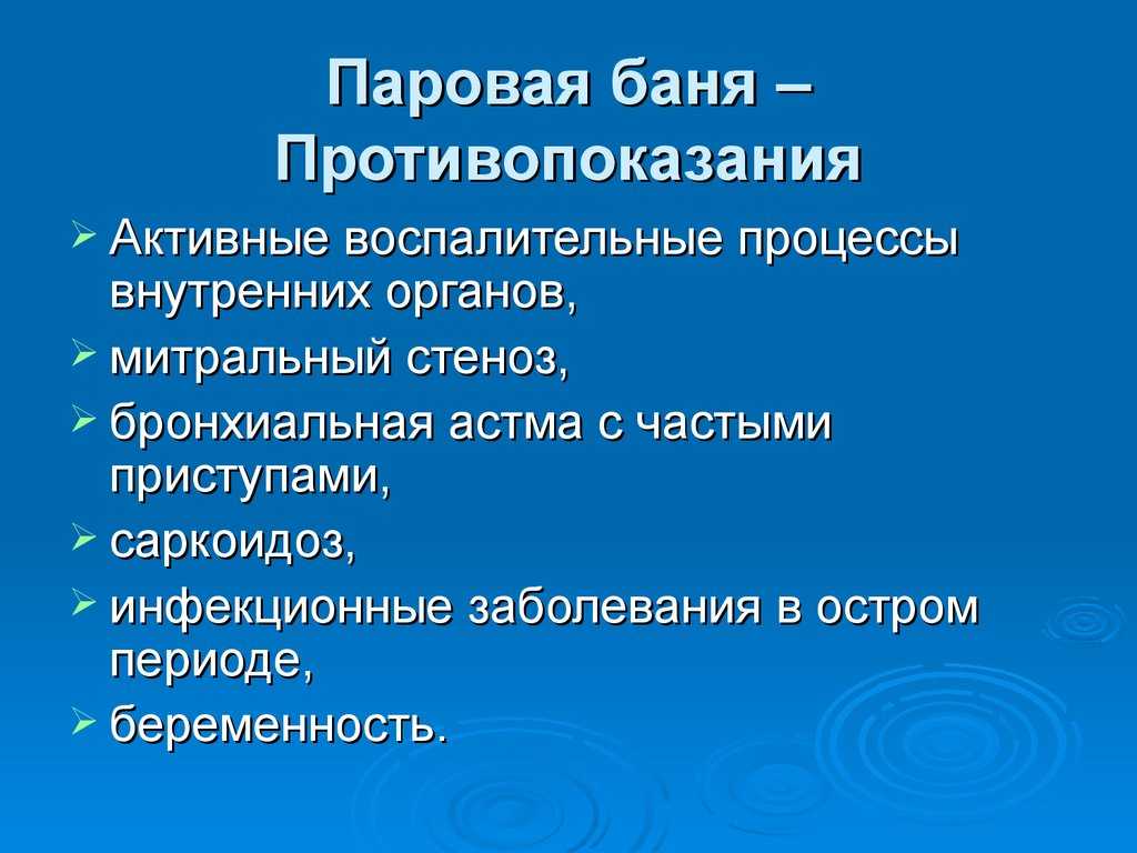 Помимо этого, при наличии следующих противопоказаний посещение подобных мест отдыха запрещено в принципе: