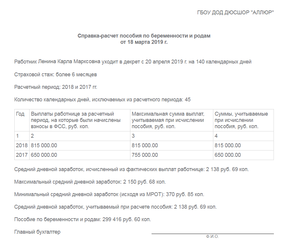 - Декретное пособие: 2138,69 × 140 = 299 416 рублей 60 копеек.