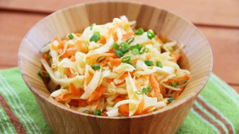 Очистив луковицу, шинкуем ее в крошку, сбрызгиваем соком лимона и немного оставляем промариноваться. Тем временем шинкуем капусту, трем морковь. Все овощи смешиваем в одной миске, заправляем маслом.