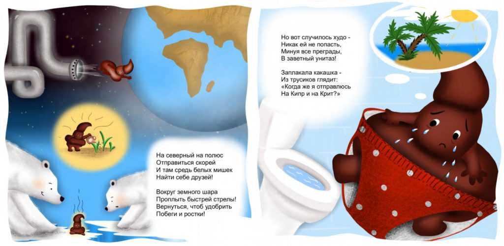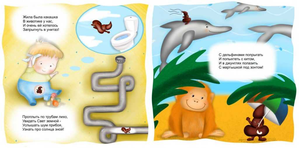 Жила была какашкаВ животике у нас,И очень ей хотелосьЗапрыгнуть в унитаз!⠀Проплыть по трубам лихо,Увидеть Свет земной —Услышать шум прибоя,Узнать про солнца зной!