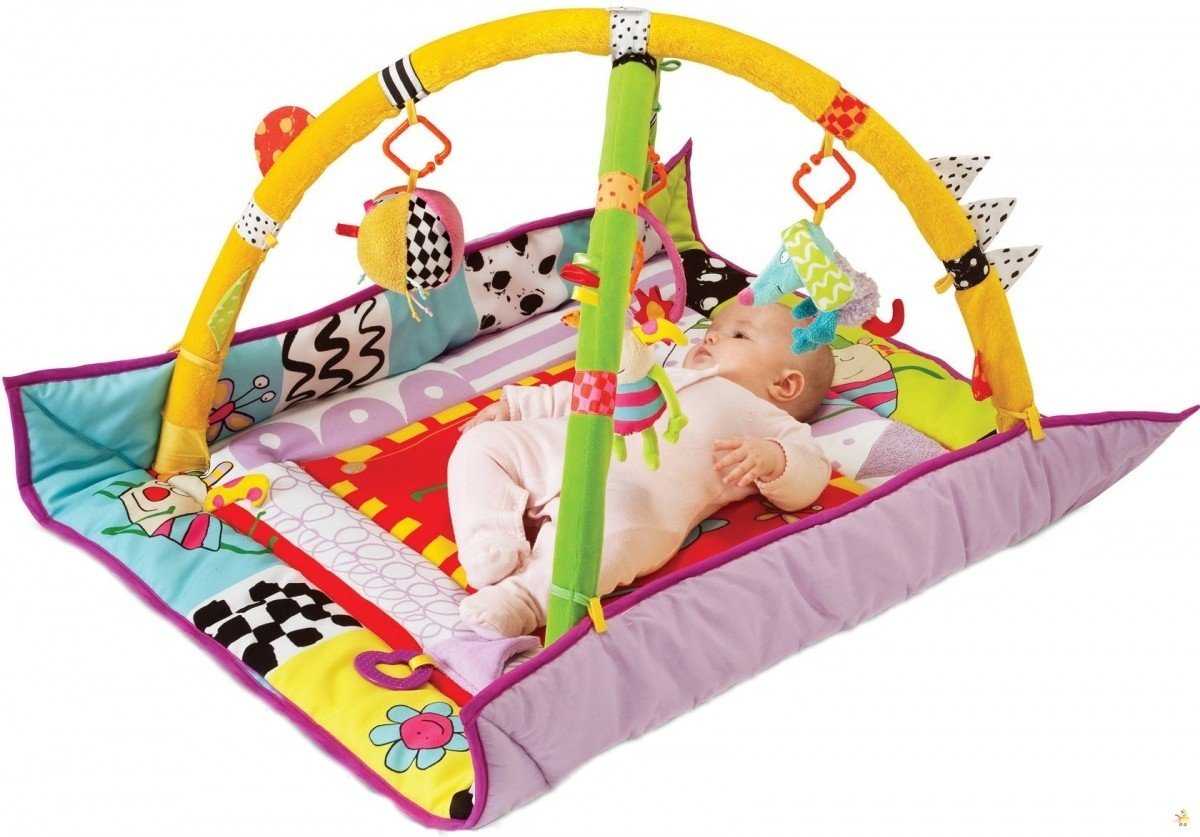 В магазинах несложно найти так называемые игровые площадки – специальные коврики. Лежа на них на спине и на животе дети изучают яркие рисунки вокруг, крутят головой, тянутся, касаются руками. В комплект одного такого коврика могут входить разные игрушки, колокольчики, погремушки.