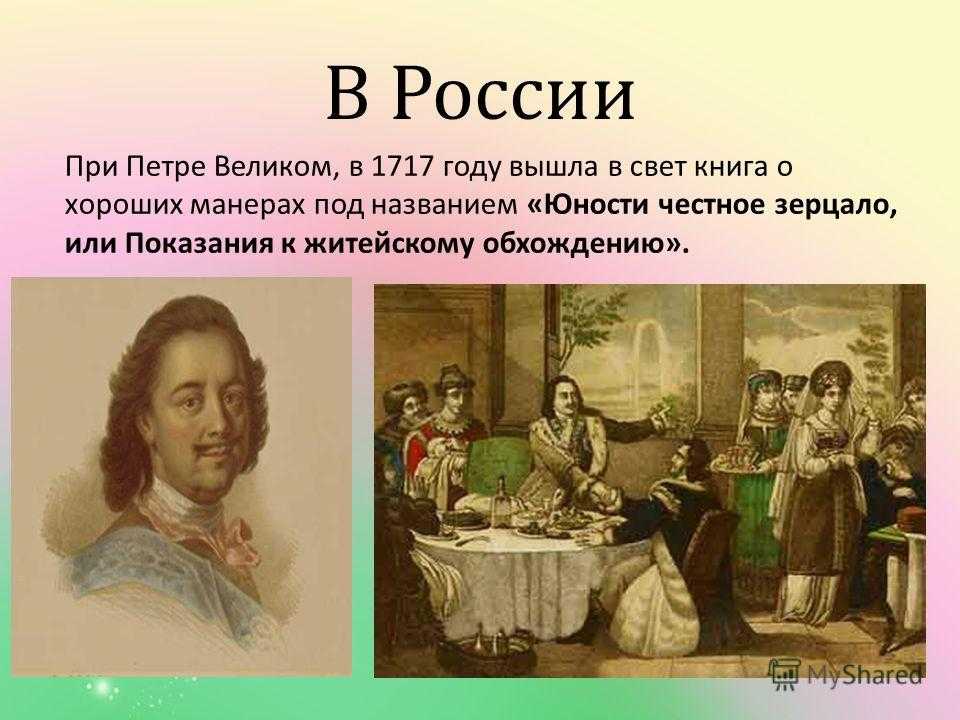 В России При Петре Великом, в 1717 году вышла в свет книга о хороших манерах под названием « Юности честное зерцало, или Показания к житейскому обхождению ».