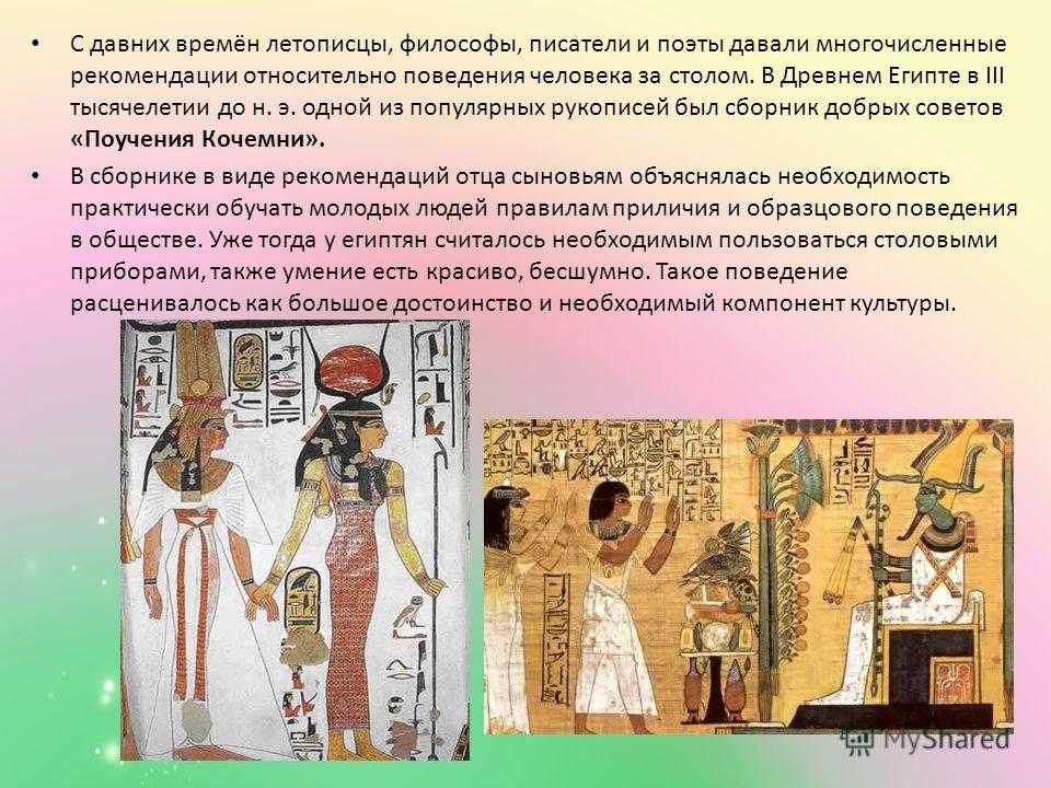С давних времён летописцы, философы, писатели и поэты давали многочисленные рекомендации относительно поведения человека за столом. В Древнем Египте в III тысячелетии до н. э. одной из популярных рукописей был сборник добрых советов « Поучения Кочемни ». В сборнике в виде рекомендаций отца сыновьям объяснялась необходимость практически обучать молодых людей правилам приличия и образцового поведения в обществе. Уже тогда у египтян считалось необходимым пользоваться столовыми приборами, также умение есть красиво, бесшумно. Такое поведение расценивалось как большое достоинство и необходимый компонент культуры.
