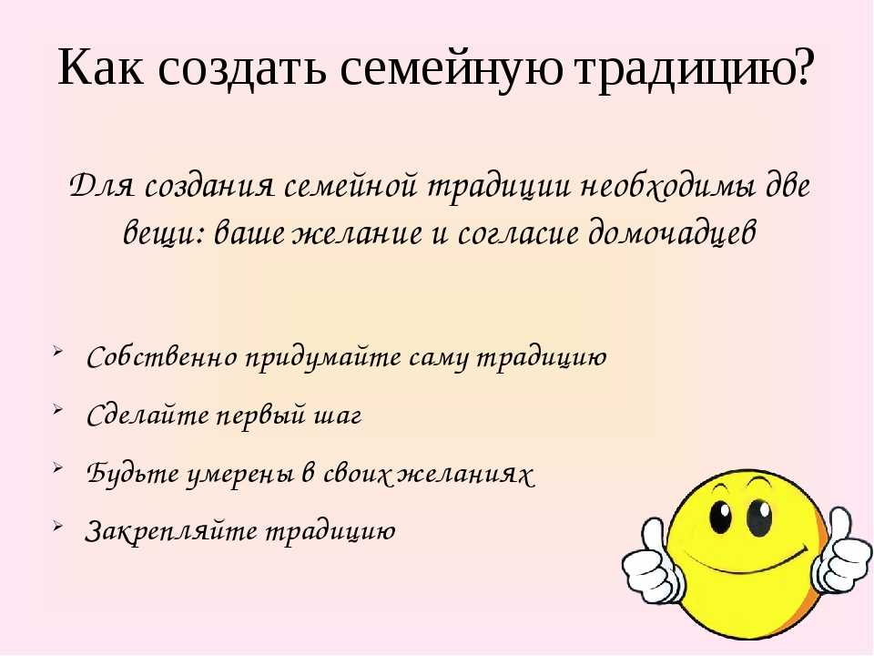 Для того, чтобы создать новую семейную традицию, необходимо всего две вещи: ваше желание и принципиальное согласие домочадцев. Алгоритм создания традиции можно привести к следующему: