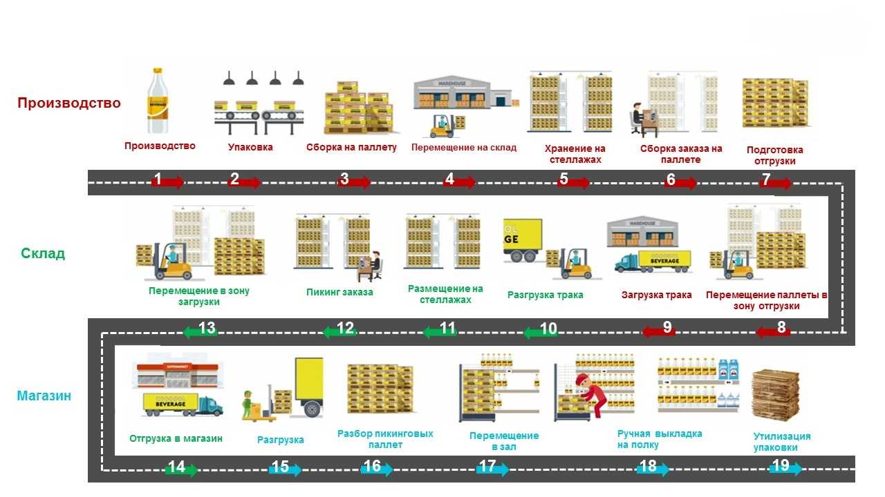 На схеме показана текущая логистическая цепочка поставок товаров от поставщика до магазина. В среднем она состоит из 19 этапов: с 1 по 9 — от производства до РЦ сети, с 10 по 14 — до отгрузки в магазин, с 15 по 19 — до выкладки на полку в магазине.