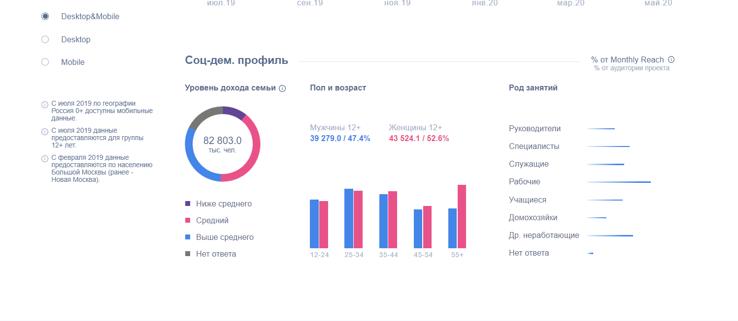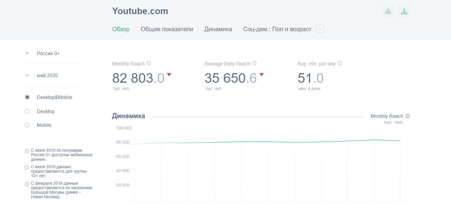 По данным за май 2020 ежемесячный охват с мобильных устройств составляет 69,9 млн человек. Это 84,4% от всего трафика.