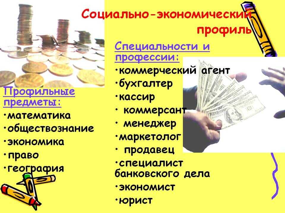 По окончании школы учащиеся социально-экономического профиля при получении необходимого количества баллов на ЕГЭ могут поступать в вузы на специальности: