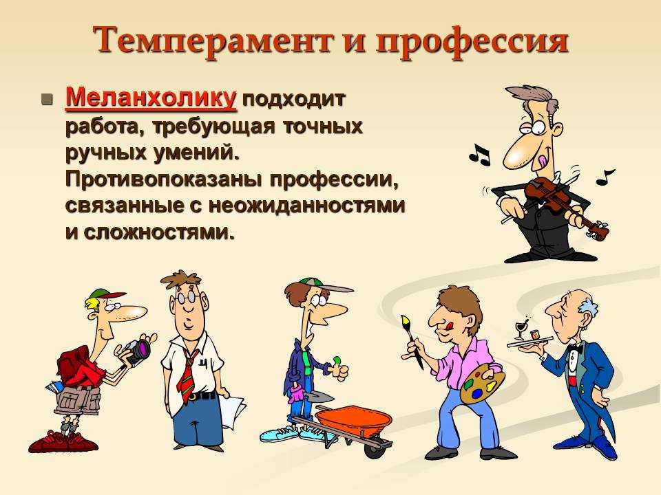 Меланхолики трудолюбивы, талантливы, внимательны к деталям и наблюдательны, но в то же время ранимы и замкнуты. Для них крайне важен позитивный эмоциональный настрой. Им лучше всего выбирать творческие профессии, не требующие общения с людьми, потому что им легче всего работается в одиночестве. Они могут стать прекрасными редакторами, аналитиками, астрономами, композиторами, художниками, фотографами, модельерами, токарями, слесарями, инженерами, механиками.