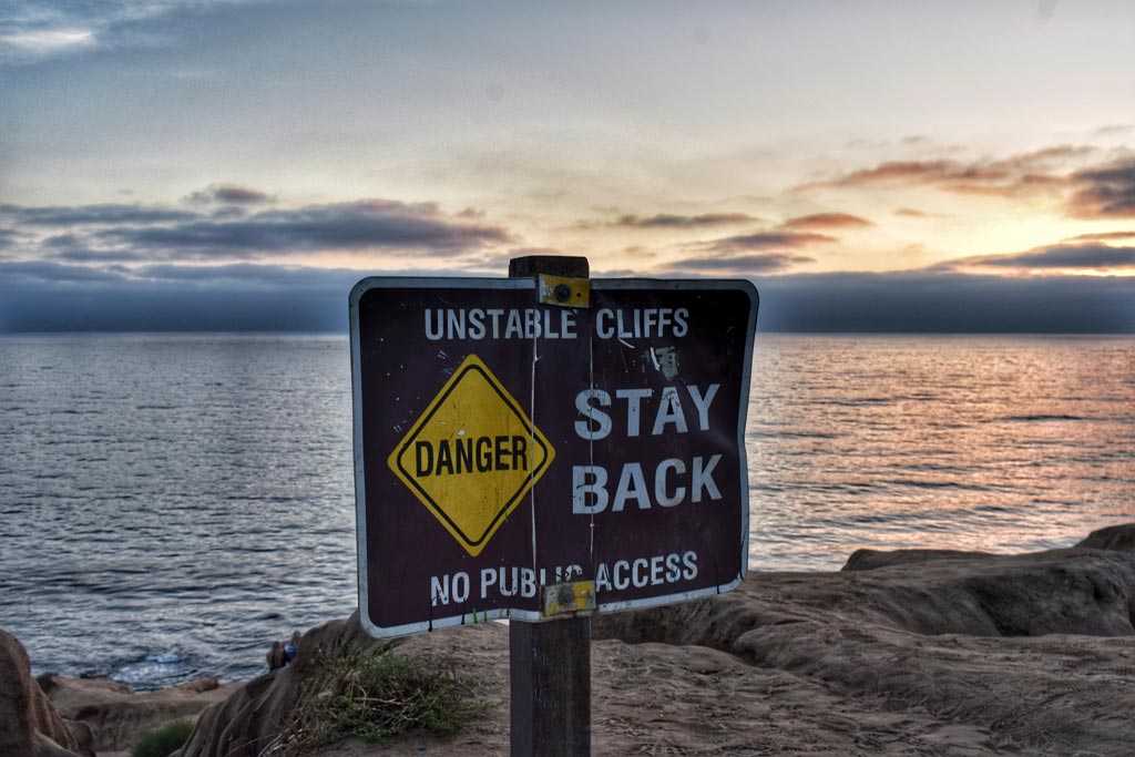 Табличка с надписью: “Опасно! Впереди скалы. Держись подальше”.