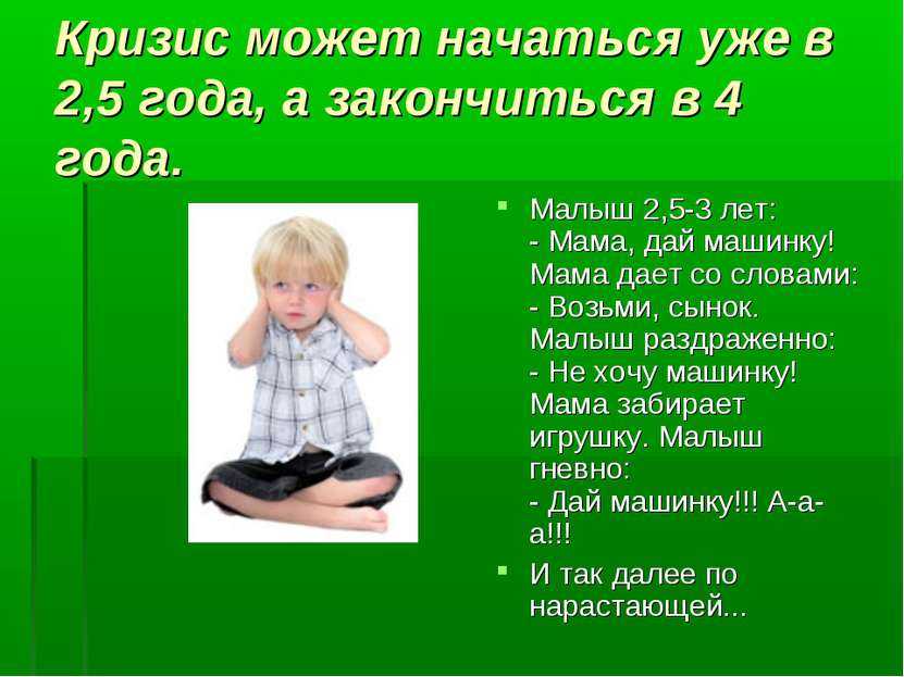 Малыш уже понимает, что мир — огромный, не вертится вокруг него. Он овладел минимальными навыками самообслуживания, пытается подражать взрослым, стать самостоятельным. В 2 года большинство детей начинают посещать детский сад и сталкиваются с очередным возрастным кризисом.