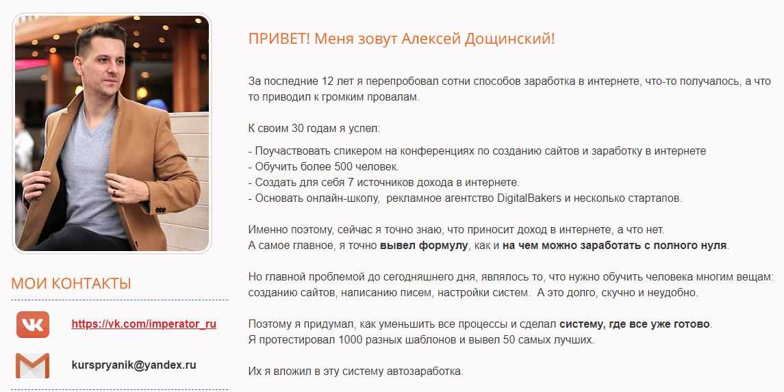 Просматривая рекламную страницу курса «Метод пряника», понимаешь, что работать предстоит с профессионалом. И дело даже не в автобиографических данных, опубликованных здесь же. Дело в том, насколько грамотно Алексей подошел к презентации своего продукта. В трехминутный видеоролик он вложил максимум информации. Пользователю понятно, на чем основан заработок, почему метод назван автоматическим, по какому принципу выстроена система обучения и в чем уникальность предложенного способа.