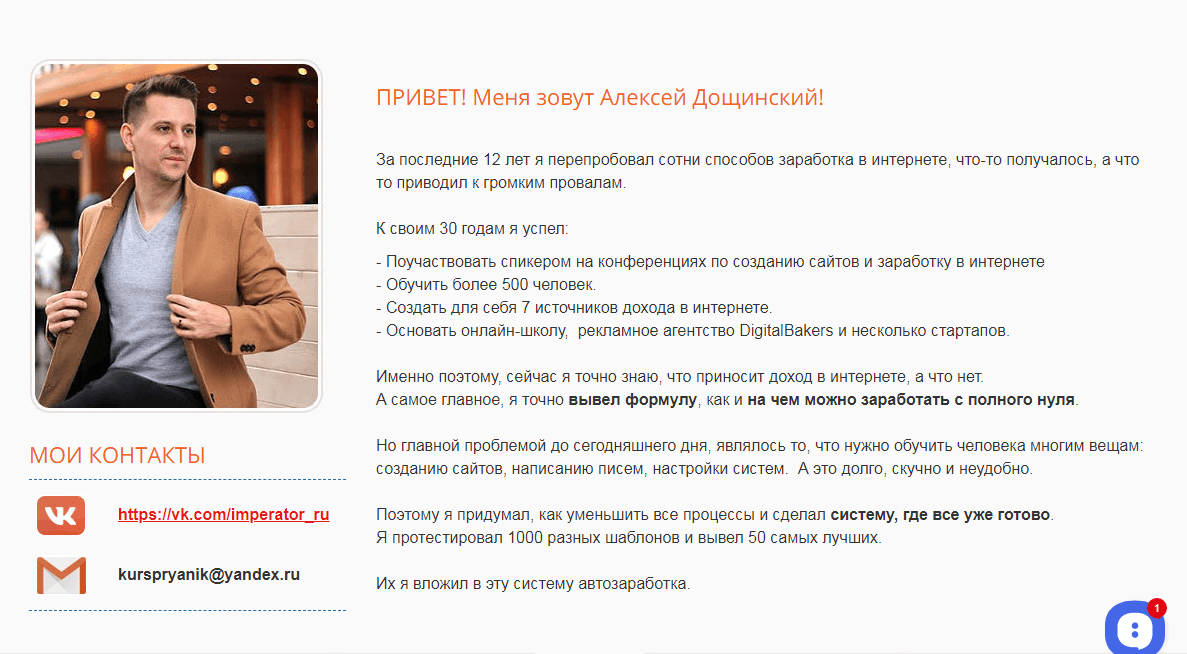 Изучая продающую страницу курса мы видим, что Алексей Дощинский не скрывается — на ней размещена вся информация об авторе, указаны несколько способов связи (ссылка на личную страницу Вконтакте и электронный адрес) с Алексеем — в случае возникновения вопросов пользователь сможет легко связаться с автором курса и получить ответы на все вопросы (служба поддержки работает 18 часов в сутки). Также на официальной странице курса мы можем ознакомиться с отзывами учеников.