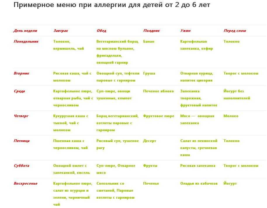 Примерное меню при аллергии для детей от 2 до 6 лет