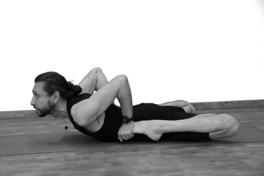 - Ардхабхекасана Дханурасана — углубленная. Займите позицию Эка Пада Бхекасана. Левая нога должна быть согнута в колене, а стопа поднята вверх. Левой рукой схватите лодыжку с внутренней стороны стопы. Потяните ногу вверх, оторвав бедро от пола.