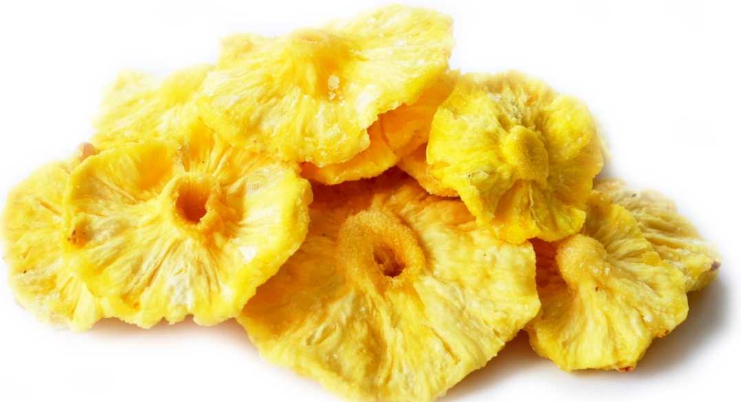 Экзотический фрукт в сушеном виде содержит в себе наиболее высокую концентрацию всех витаминов и минералов. Ломтики сушеного ананаса более всего способствуют пищеварению и очищению кишечника, так как богаты пищевыми волокнами. Не стоит забывать и о высокой калорийности цукатов, которые противопоказаны детям с ожирением.